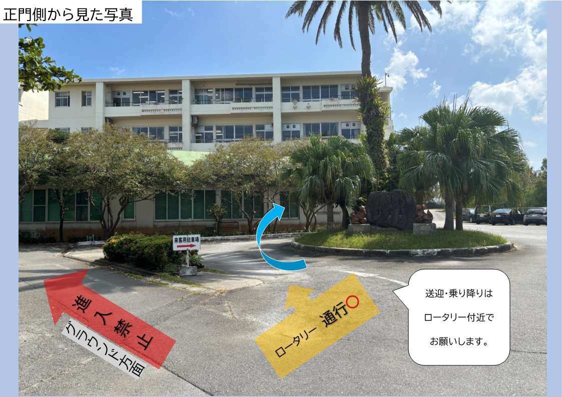 生徒送迎の際、ロータリー外で生徒を乗降させている車両や、高速度で校内に侵入する車両が見られます。生徒の安全確保のため、生徒の送迎はロータリー内で乗降するよう、ご協力お願いいたします。